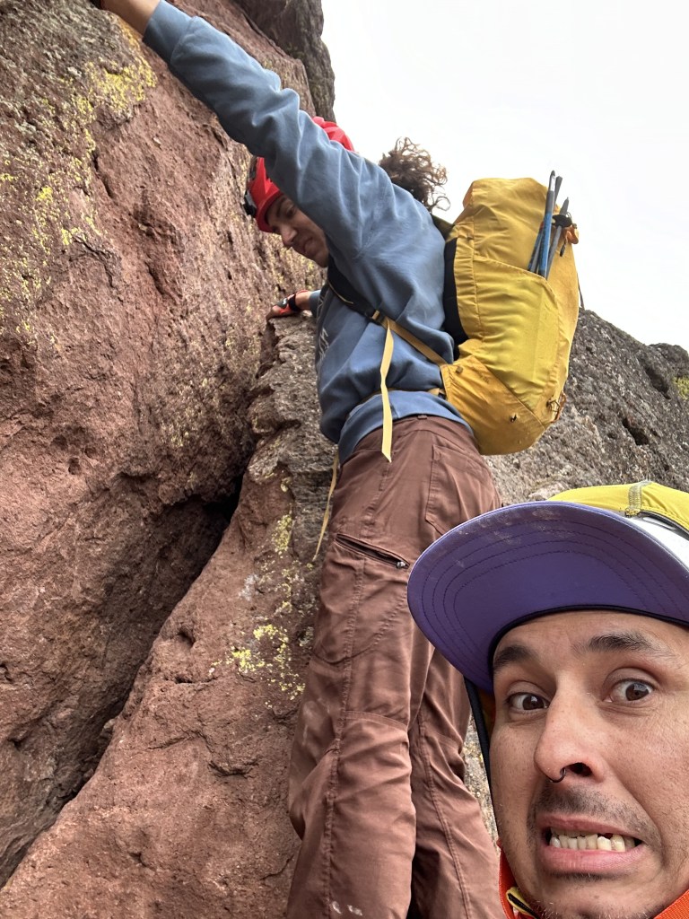 A quick 2.5 hours away from my mother’s house on the Yakam Reservation is Smith Rock. Feeling bad for missing her birthday (St. Patrick’s Day), I carved time out to visit on Easter Sunday. After enjoying some freshly caught Yakama Salmon, I bopped down to Smith Rock with Aloo (my husky), to meet up with Cecil, a friend and fellow guide from Climbers of Color. Unfortunately, the stable weather window had devolved into a steadily approaching storm which brought equally favorable overcast and snow on the final morning. Upon arrival on 4/3 around 1500, I was keen to jump right into the climbing and now waste any time. Our first route in mind, Pack Animal 2P 5.8R, really gave me a run for my money. Between a large swing potential with a tiny nut for protection, the traverse into the first anchor made for an exciting beginning to the 2024 rock season! Pitch 2 looked not too bad although, in classic fashion, it is always steeper than it looks. Navigating two bulges with okay-feet, the wonky tuff of Smith proved engaging protection not readily good. Through some effort and grunting, both Cecil and I made our way up and were excited to get back down. Retreating to my favorite BLM spot above the Deschute River, we feasted after our spicey 2P adventure on day one; surely, it was going to be an exciting trip.