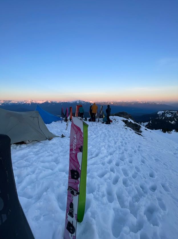 Settling into our snow camp with views into the N. Cascades, I rummaged about while the team deliberated the time plan and execution for our summit and ski bid. This gathering excites me the most: a mid-size team coming together to plan a new, unknown adventure, implementing various skill sets with the end goal of type-1, knee-saving skiing/split-boarding. For most of the crew, it was their first time saddling up to ski a volcano; although, everyone had climbed one on foot– not every layer was unknown. While the team hemmed and hawed, I bit my lip. Ultimately, the six person crew deliberated rather efficiently and concluded for a 0500 departure under the Northern Lights! Primary goals included summitting as a team, then, pending conditions, ski the Boulder Glacier, or our ascent path, the Squawk. The remainder of the evening was spent packing in a flurry, and soon enough, we rolled our buffs over our eyes as we attempted to sleep at the spry hour of 2000.