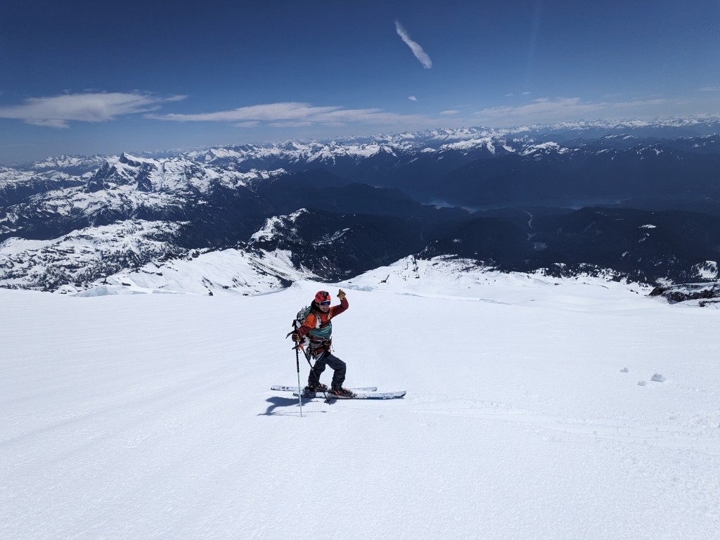Alpine starts such as this are hard to not be exciting; especially, when there is a light cascading above that moves and breathes like a sea creature. We would spend several minutes prepping then lose focus observing the solar-flare induced Northern Lights– what a treat! Dawning our action suits, we began the ascent from 6,000’ up the Squawk. Although I had intended Aivy & Manny to lead portions throughout the day, it felt pertinent to lead out the gate considering the firm surface conditions and long slide potential. Uneventful movement carried us all the way to the Sherman Crater at the base of the Roman Wall. A quick section of short roping dwindled giving way to a glorious boot pack straight to the summit. As the revolving door of skiers and climbers made the summit pic rounds, we carved a space out on the summit plateau. Discussing with the team, we felt keen to give the Boulder Glacier an attempt, but, someone had to be the ginnie pig for a surface condition check. Considering I had the most experience with glaciers and skiing them, I found myself shuffling over to the Southern edge of the Football Field toeing the line of regret and excitement. Standing by on the summit, Manny prepped his camera in the chance the conditions were green lighted. With the checker flag waving I dropped in. Quickly, I found conditions quite favorable, carvable corn above the Sherman Crater with the May sun beating down, I was all smiles and hollers.